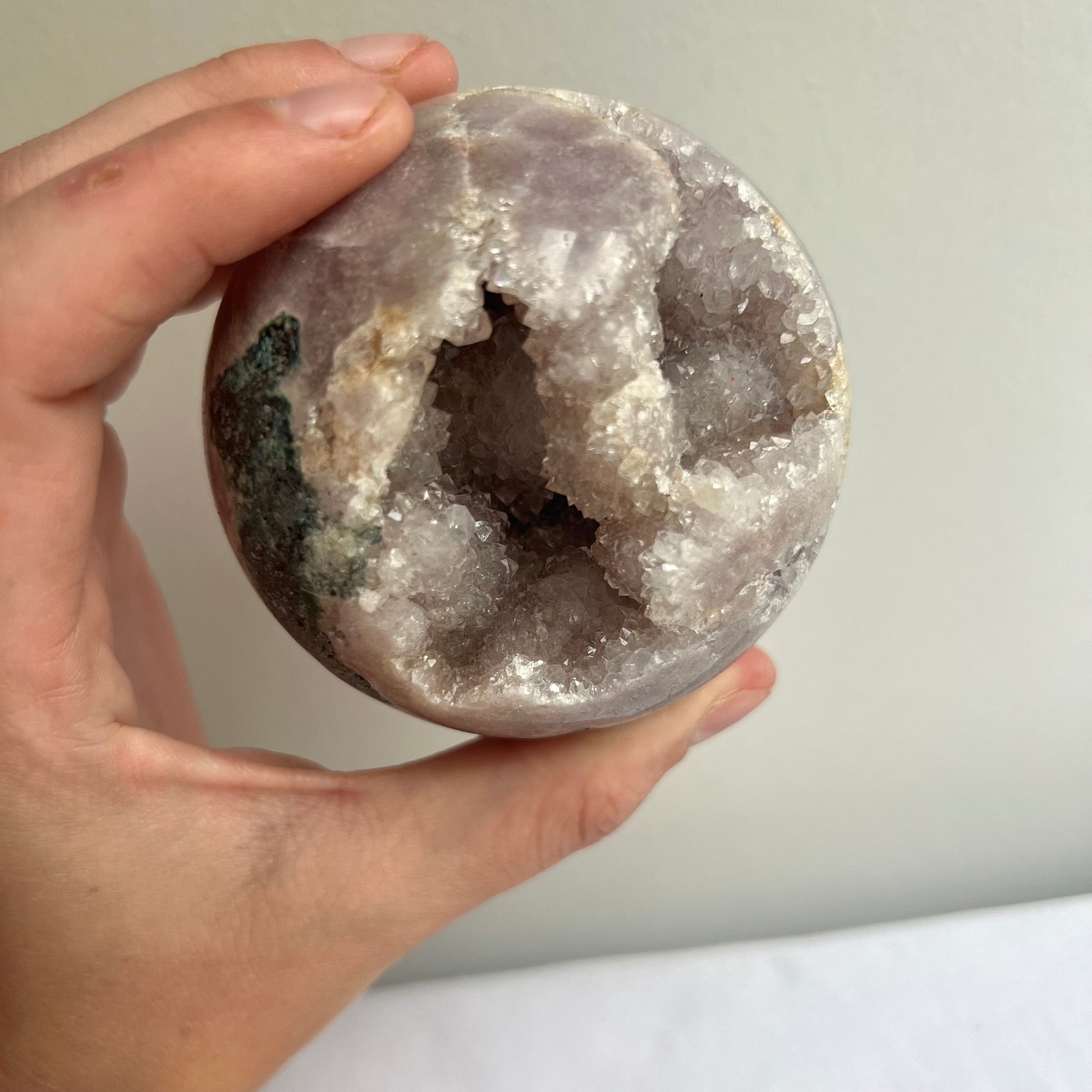 This stunning Pink Amethyst sphere with Jasper measures 72mm in diameter, and has a large druzy pocket in the front. 💗