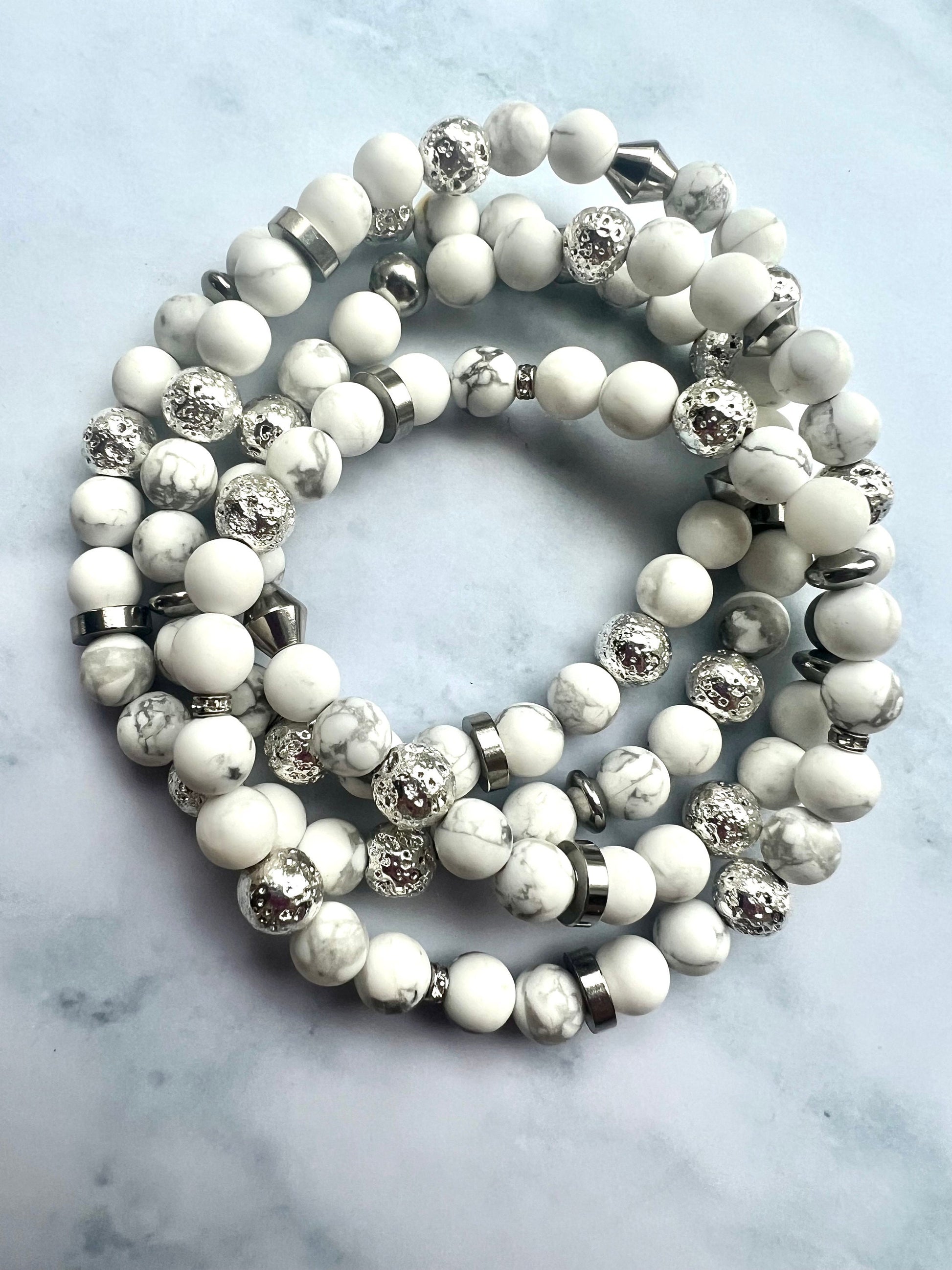 1 Handcrafted Howlite bracelet made with 6mm matte Howlite beads, stainless steel accent beads & Electroplated Lava stone beads suitable for essential oils. 💗