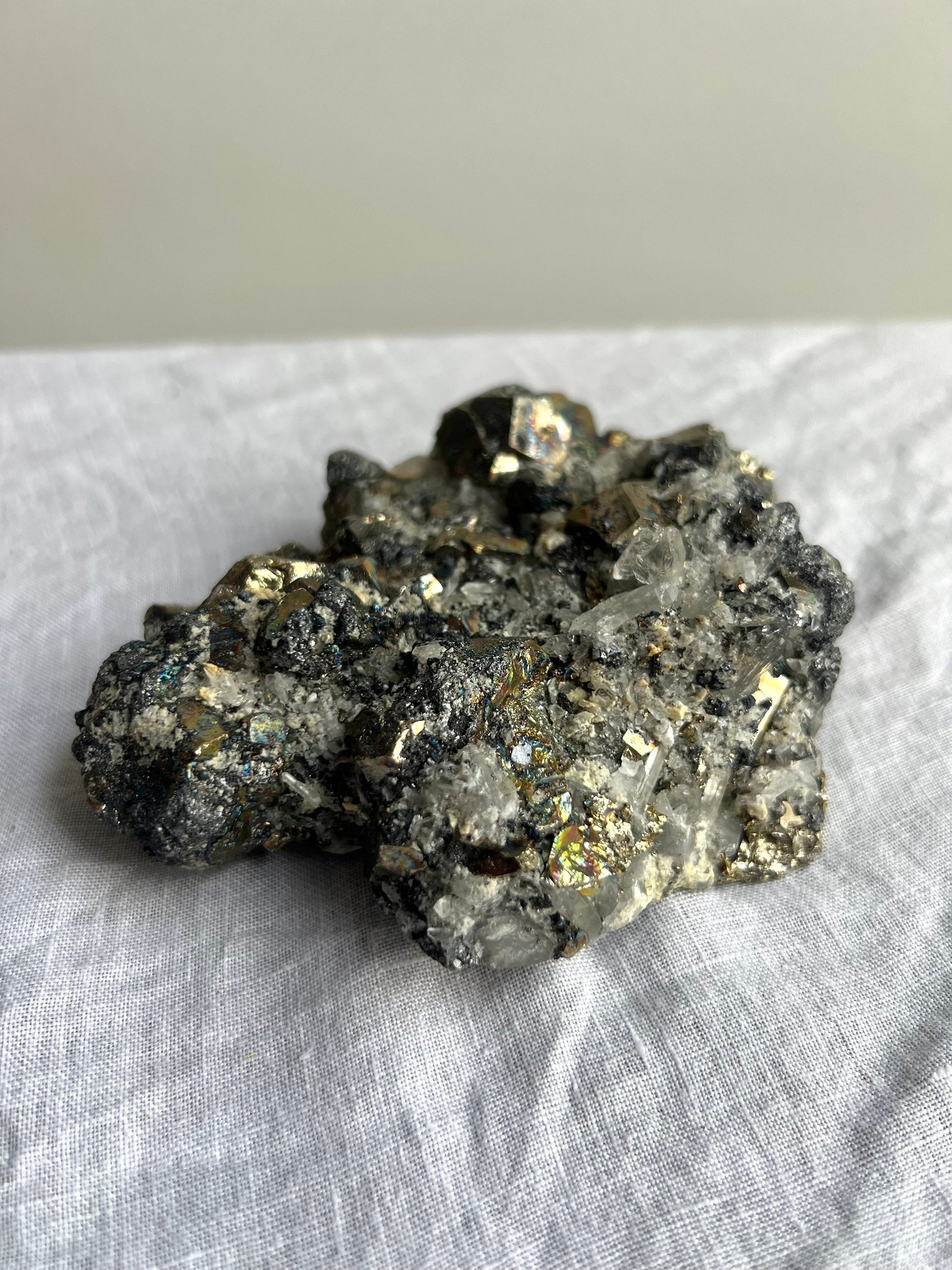 Listing is for this exact rare Rainbow Pyrite on Calcite specimen pictured above. Contains quartz inclusions. Collectors item.